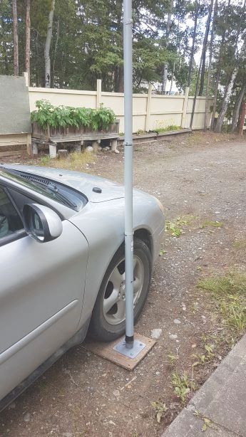 I built a drive-on mast support a few years ago with a 24" 1" diameter steel water pipe, a flange, and scrap plywood. It worked well for the SOTABeams fibreglass Travel Mast, but I wanted something sturdier for a heavier portable aluminum mast. Home Hardware supplied all the parts for less than $40: metal leg base for a scaffold, a 18" 3/4" diameter pipe, and two PVC pipe connectors.