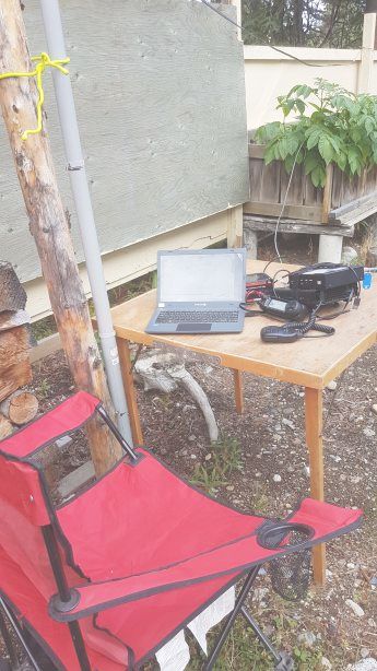 - twenty year old K2, 9Ah LiPO4, 30' SOTABeams Travelmast, 24' vertical and counterpoise, 9:1 unun, AT100 ATU, small stool, Evolve3 laptop, Signalink, Palm key, earphones, school backpack.