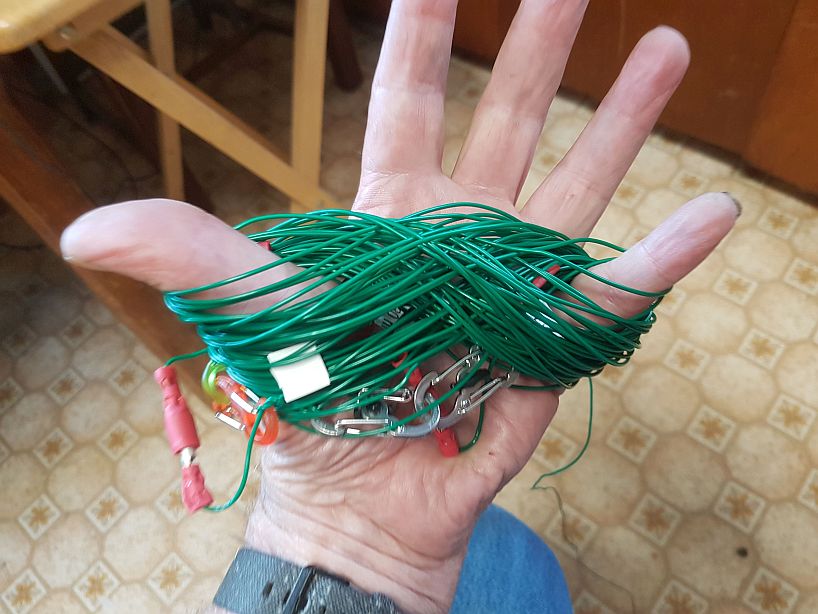 A 100 wt linked dipole antenna was built as a demo for YARA Field day, but was not set up. Materials: bits of 18 ga speaker wire, auto wire bullet connectors. Tested with SOTABeams portable mast, on a tower with pulley, and on 14' 2x3 with pulley with 4:1, 2:1, and no baluns. Fed with coax. Easy to use, very quiet antenna as set up in my front yard. For portable 40-20-17m you can disconnct the longer pieces of wire and leave them at home.Theory On-line Calculator Pictures can be seen in the photo albums.